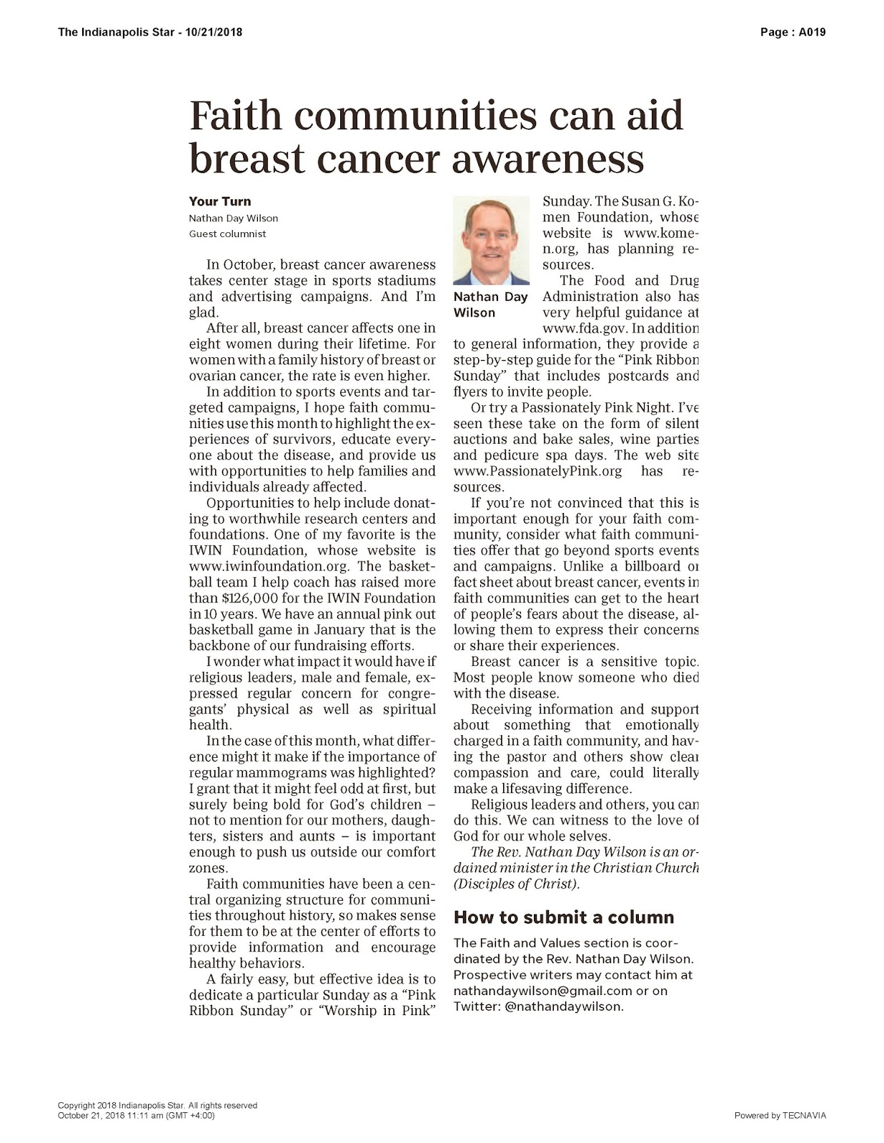 Faith communities promote spiritual and physical health Posted byNathan Day WilsonOctober 21, 2018April 26, 2020Posted inText Posts, UncategorizedTags:breast cancer, breast cancer awareness, Christian Theological Seminary, community, CTS, faith and health, healthcare, social action, wholeness, women Share this: Click to share on X (Opens in new window) X Click to share on Facebook (Opens in new window) Facebook Like Loading... Related
