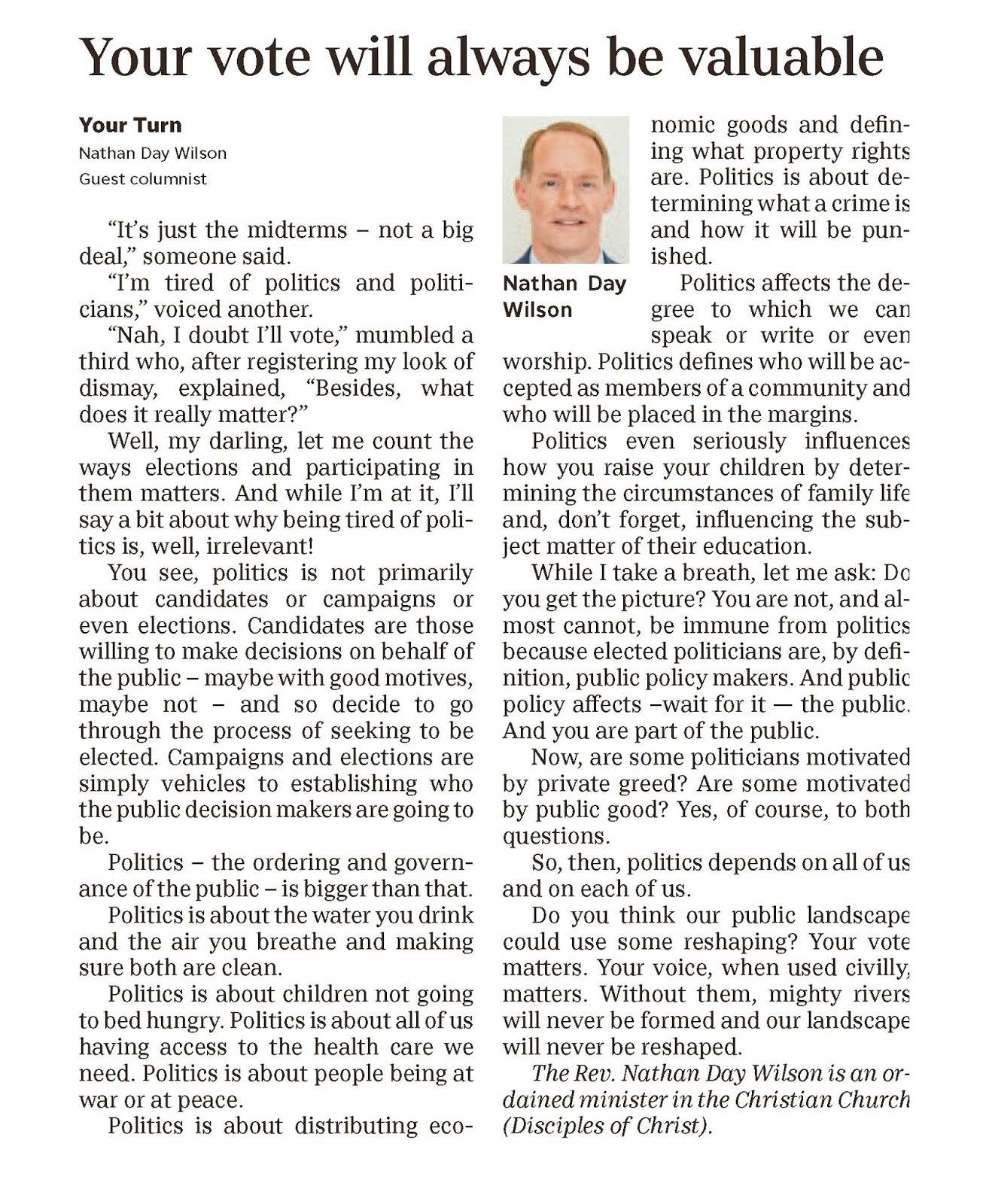Politics permeates — your vote is valuable! Posted byNathan Day WilsonNovember 4, 2018April 26, 2020Posted inText Posts, Uncategorized Share this: Share on X (Opens in new window) X Share on Facebook (Opens in new window) Facebook Like Loading... Related